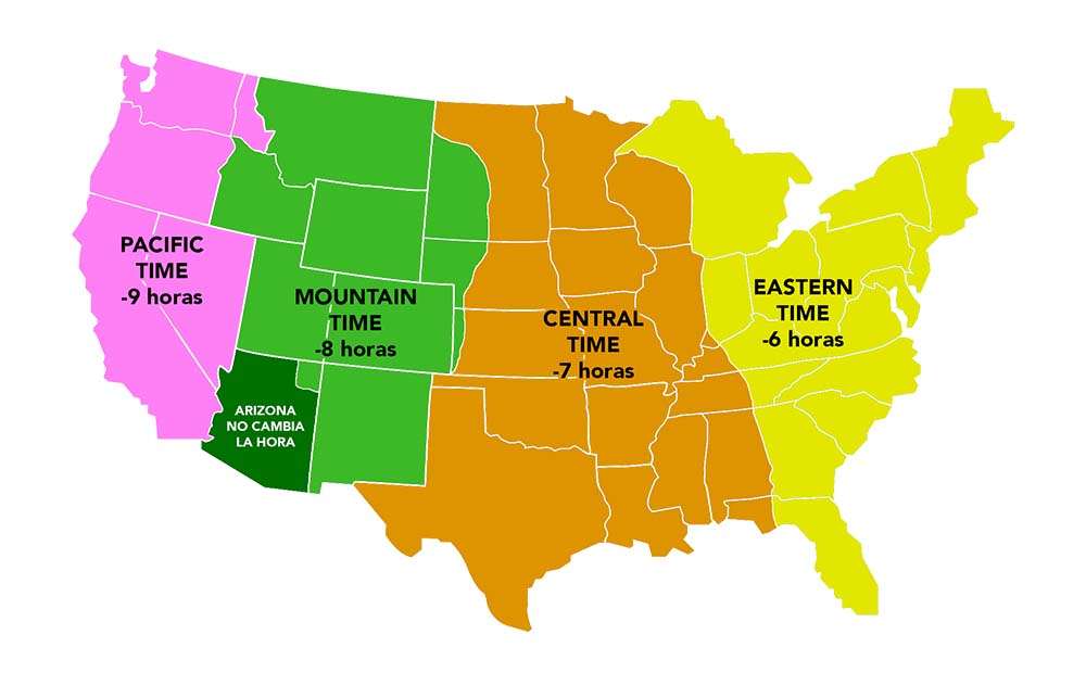 Finalmente, el huso horario del Oeste incluye los estados de Texas, Montana, Wyoming, Colorado, Nuevo México, Idaho, Utah, Arizona, Nevada, California, Oregón y Washington.