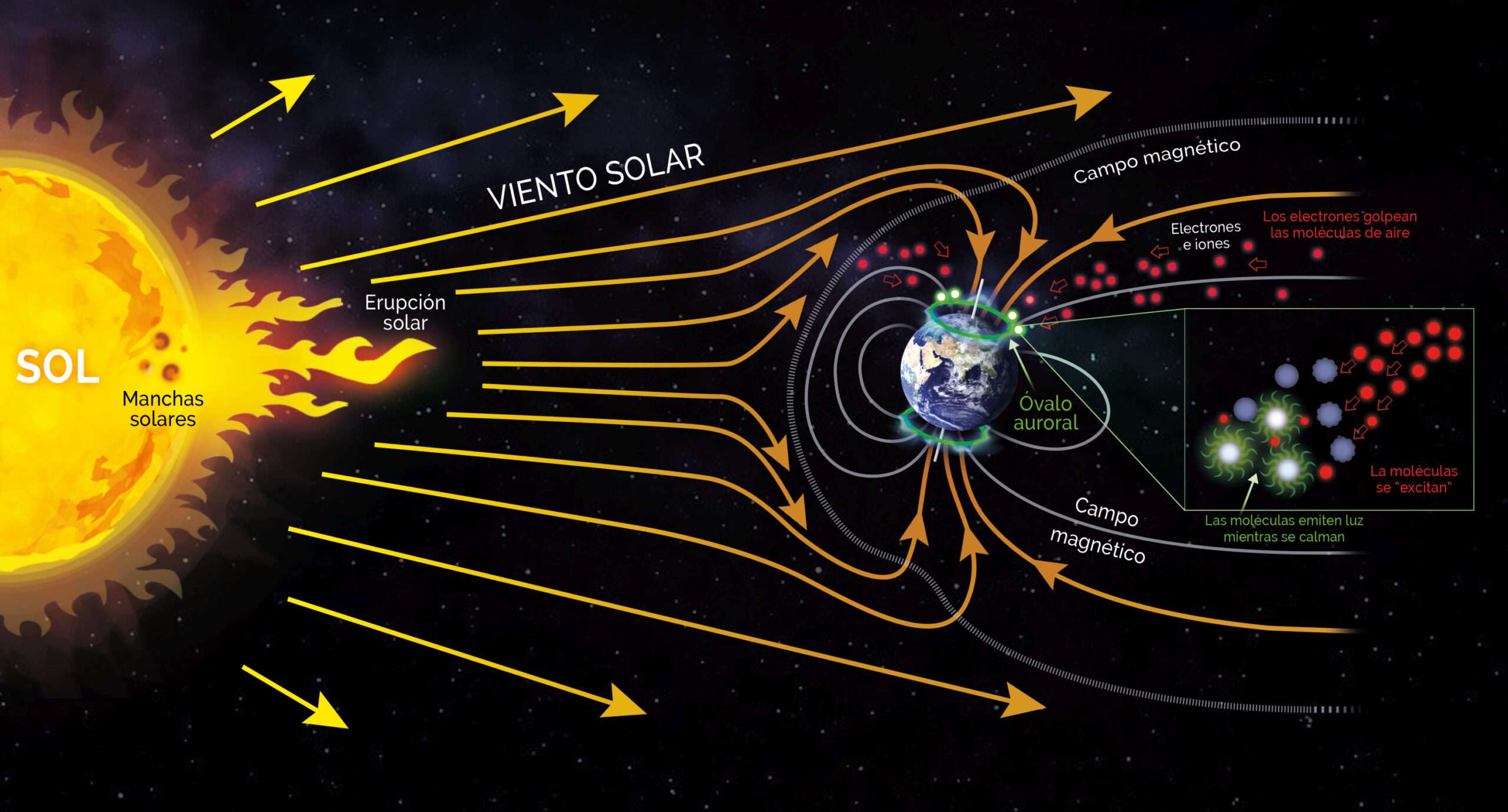 Cuando las partículas cargadas chocan con la atmósfera terrestre en las regiones polares, excitan los átomos y las moléculas de la atmósfera. Esto provoca que los átomos y las moléculas emitan luz, lo que produce las auroras boreales. Los colores de las auroras boreales dependen de los gases que se encuentran en la atmósfera, siendo el verde y el rosa los más comunes.